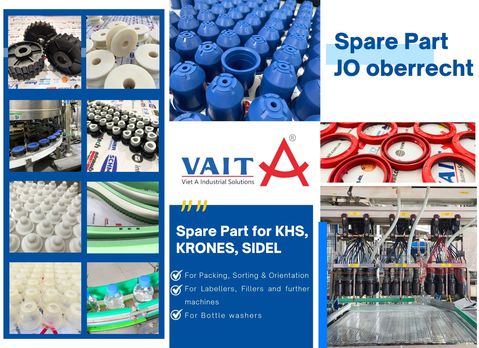 JO cung cấp phụ tùng cho máy rửa chai, máy chiết chai, máy dán nhãn, máy xếp chai vào két và kèm theo phụ tùng thanh nhựa dẫn hướng và nhôm truyền động cho băng tải chai, lon, tải thùng.